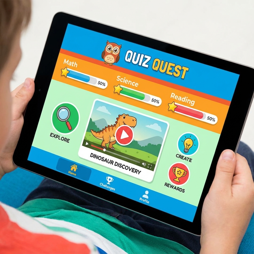 An interactive learning app for students featuring video lessons, quizzes, and progress tracking gamification.